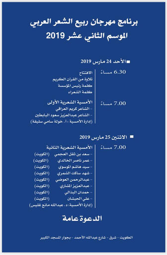 بينما يضم اليوم الثاني الشعراء: د.سعد بن ثقل العجمي وعمر ناصر الخالدي وسيد هاشم الموسوي وشهد ساكت الشمري وعبدالرحمن العوضي وعبدالعزيز المشاري وحمدان البذالي وعلي الحبشان ويدير الأمسية الدكتور عبدالله مانع غليس.
