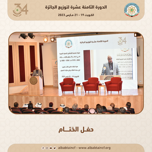 اسدلت مؤسسة عبدالعزيز سعود البابطين الثقافية الستار على فعالياتِ دورتها الثامنةَ عشْرةَ التي نظمتها برعاية كريمة من سمو امير البلاد الشيخ نواف الاحمد الجابر الصباح "حفظه الله ورعاه" والذي ناب عن سموه في حفل الافتتاح وزير الاعلام وزير الثقافة والشباب عبدالرحمن المطيري؛ تكريمًا للمبدعين من الشعراء والنقاد الفائزين بجوائز المؤسسة في الدورتين17 و18 ، واحتفالًا بصدور معجمِ البابطين لشعراءِ العربيةِ في عصرِ الدولِ والإمارات، مع احتفاءٍ خاصٍّ بالشاعريْنِ ابنِ سناءِ المُلْكِ وابنِ مَليكِ الحموي، وذلك يوم الاحد التاسع عشر من مارس الجاري بمسرح مكتبة البابطين المركزية للشعر العربي واستمرت على مدى ثلاثةِ أيامٍ انتهت في يومِ الثلاثاءِ الحادي والعشرينَ منه؛ وشهد اليوم الختامي اقامة ثلاث جلسات أدبية؛ وامسية كانت خاتمة للامسيات الشعرية؛ وشهد حفل الختام كذلك القاء البيان الختامي للمشاركين في الدورة من الباحثين والشعراء والادباء متضمنا توصيات خرج بها المشاركون؛ الى جانب كلمة رئيس أمناء المؤسسة الشاعر الدكتور عبدالعزيز سعود البابطين الثقافية.